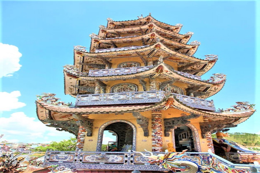 Especially, in the front yard of the pagoda, there is a 36m high bell tower, hanging a bell with the height of 8,500 kg, the largest bell in the Central and the South Vietnam. The bell is 4.38 m high, 2.34 m wide. The bell is embossed with four words: Linh Phuoc Tu Chung and many statues, pagodas and patterns, Scenes of One Pillar Pagoda (Hanoi), Thien Mu Pagoda (Hue), Linh Phuoc Pagoda (Dalat) Four sides: Xuan, Ha, Thu, East have 8 dragon