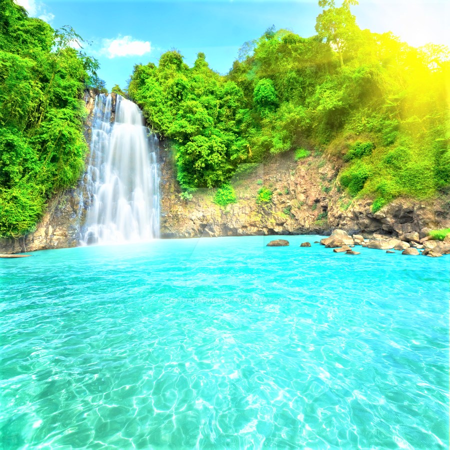 Beneath the waterfall is a small lake with long-lasting water forming, beside the lake there are large rocks look like stone tables and there are many tall trees to cover a large sky.