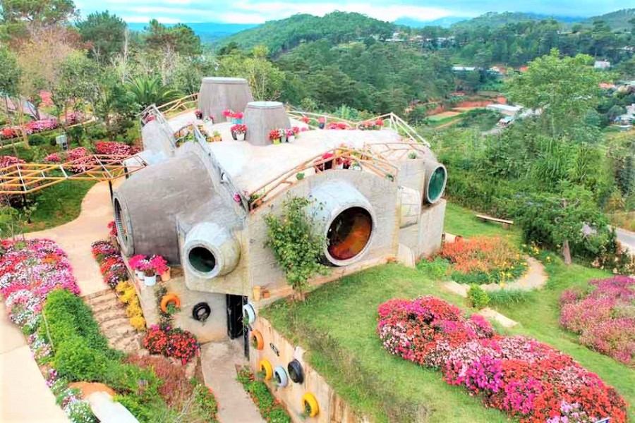 Next to the "roof" house is a "Drum" house with the shape of a drum, with 20 "drum surface" made of glass can reflect the light to create a variety of images and colors. When the intensity of outside light is different, especially at dawn or sunset ... According to the owner (Le Thi Ngoc Trinh), the idea of the drum house is born from fairy tales of the local people in Central Highlands. There is a heavy flood that engulfs every creature, only a pair of young men and women drifting together with a pair of dogs, a pair of chickens, a pair of buffaloes, a pair of pigs, and so on luckily, they got in some Drums that they still survived.